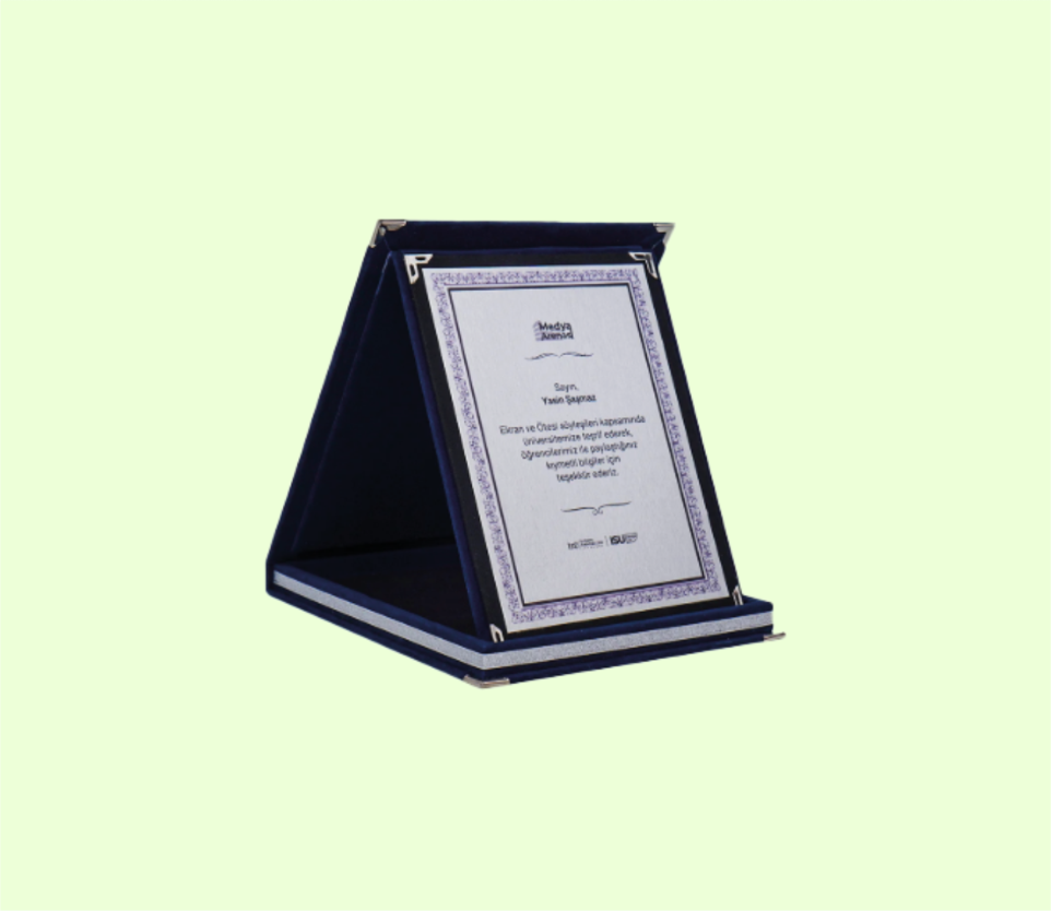 şık kadife kaplama, kaliteli metal veya pleksi levha ve net kazıma / baskı detayları bir araya getirilir. Kurum logosu, isim, tarih ve özel metinler ile hazırlanan kadife plaketler; ödül törenleri, teşekkür organizasyonları, spor etkinlikleri ve kurumsal kutlamalar için ideal bir tercihtir.